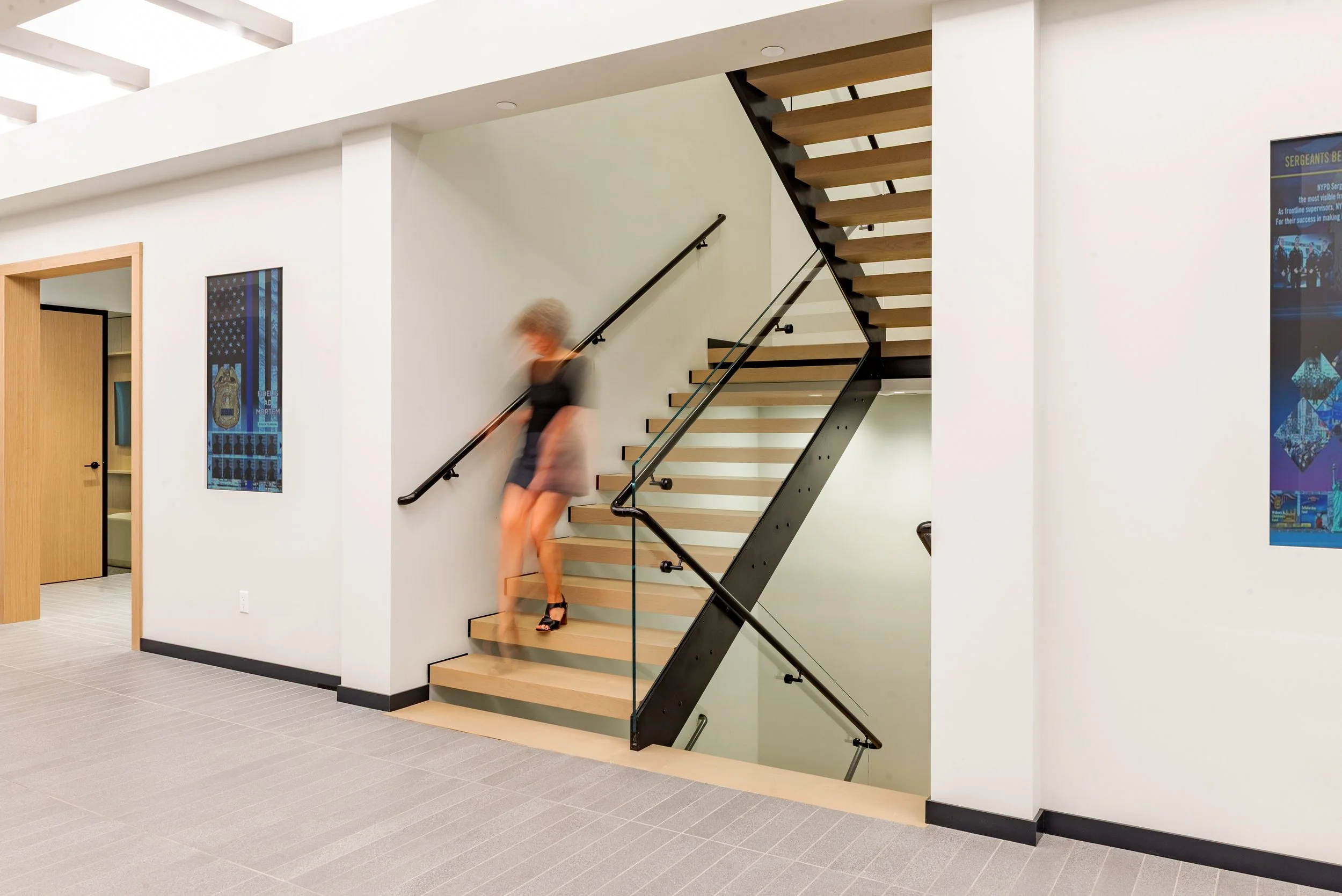 The SBA offices are anchored by a three-story open stair, the large landings are also a meeting place that fosters the connections between the departments The first-floor public space, defined by the “Street” houses the reception, SBA store and conference center.